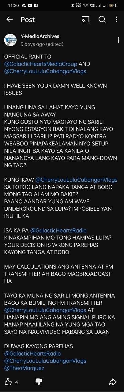 The situation intensified when YmediaArchives entered the picture. As a YouTuber known for relaying broadcasts, they began amplifying RKW’s content while simultaneously publishing a rant directed at GHR, Galactic Hearts Media Enterprise, Theo Marquez, and Cherry Lou Cabangon.